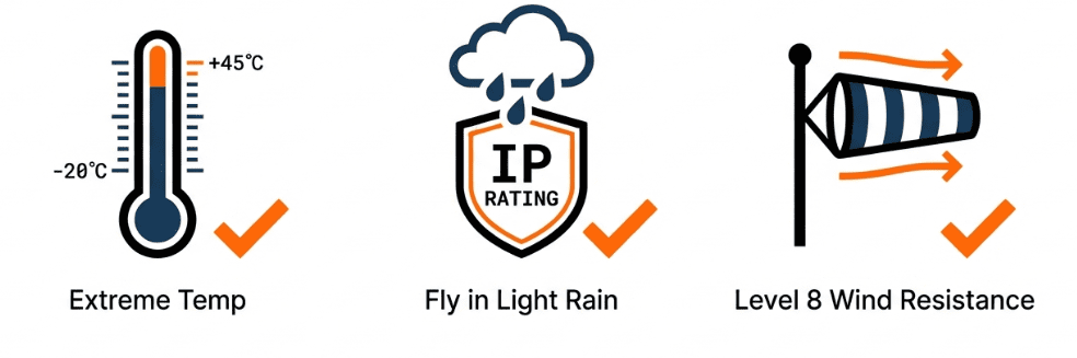 Yes. The platform supports -20°C to 45°C operation, light rain, and high wind conditions depending on configuration.