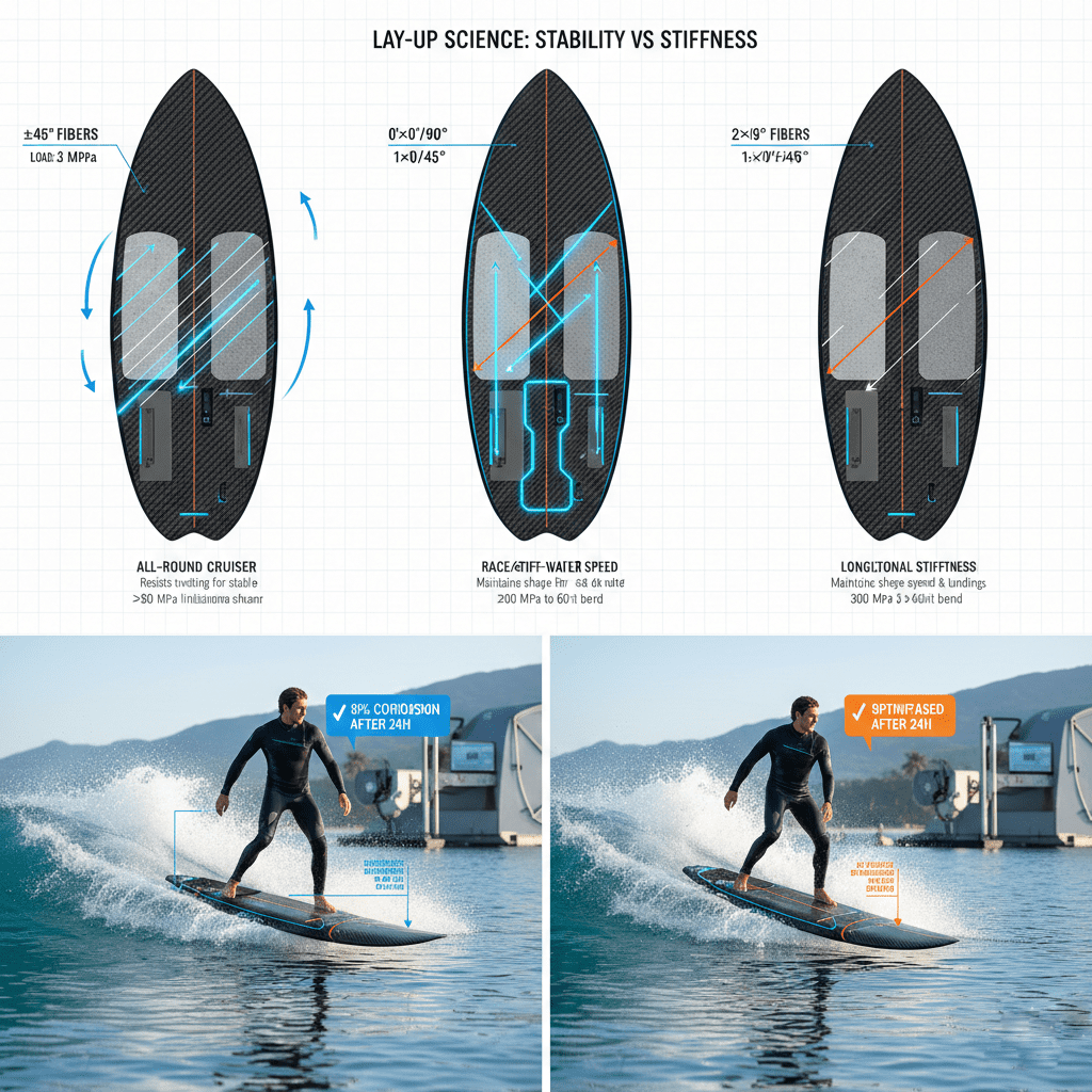 To visualize this, side-by-side diagrams can illustrate how ±45° fibers resist twisting while 0°/90° fibers contribute to stiffness. For riders who crave explosive pop off the wake or need extra rigidity for slicing through chop, understanding these angles helps tailor the perfect board to your style.