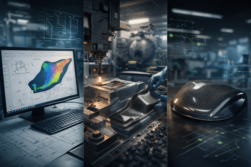 We support companies at every stage of carbon fiber product development — from concept engineering and structural design to tooling, prototyping, and mass production.