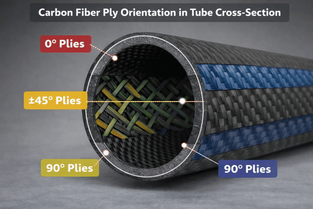 - Hybrid orientation: 0° plies handle axial loads, ±45° resist torsion, and 90° layers manage side impacts.