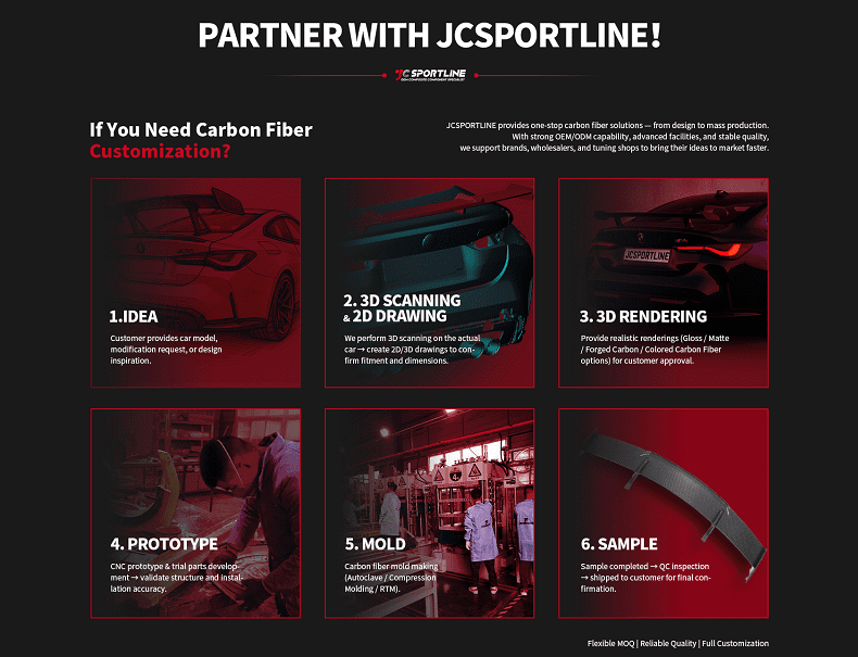 At JCSPORTLINE, we go above and beyond to ensure your carbon fiber spoilers meet the highest standards. Here’s how we maintain consistent quality across all of our products: