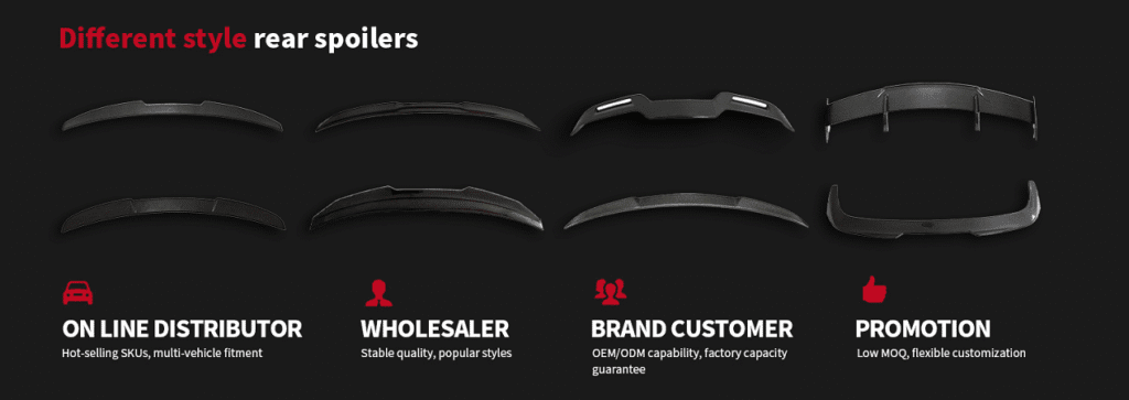 - Ducktail Spoiler: Ideal for customers looking for a sporty and aerodynamic look, offering moderate downforce and an iconic appearance.