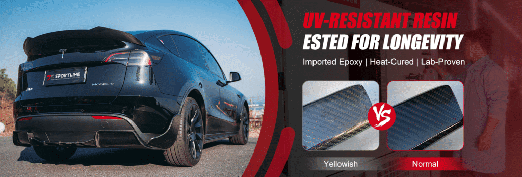 - Yellowing Resistance – True Material Quality: With our specialized resin technology, your carbon fiber spoilers are UV-resistant and undergo 1500 hours of UV exposure without yellowing. 3 years without yellowing is what we call true material quality. This ensures your customers experience long-lasting finishes and consistent performance.