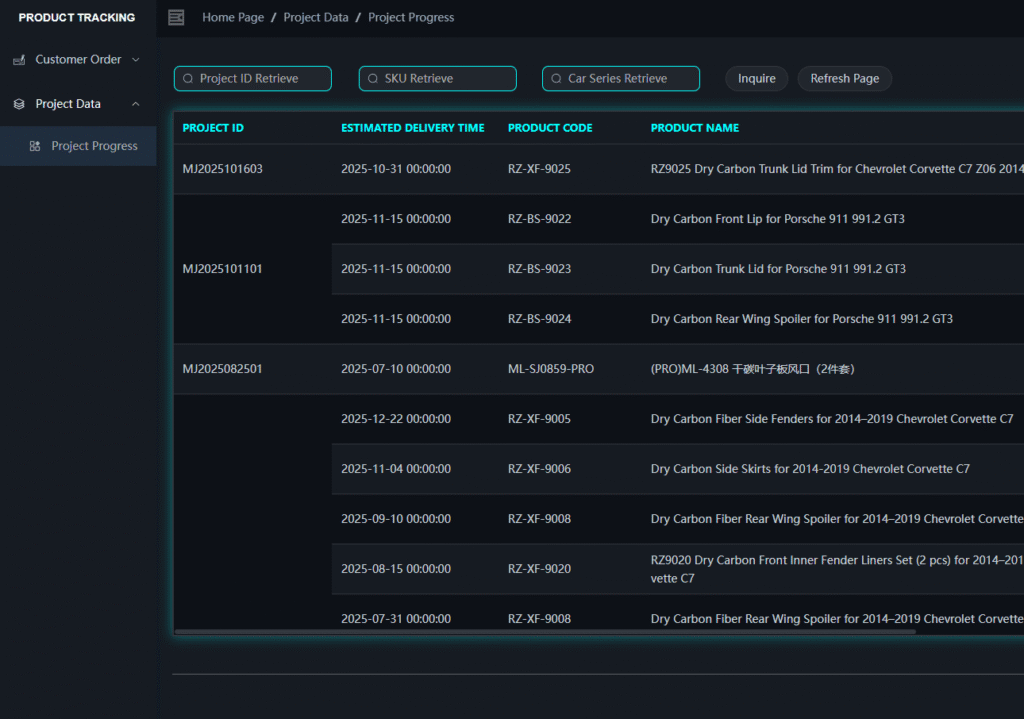 Carbon fiber projects often face long development cycles and poor visibility. JCSPORTLINE eliminates these issues with a fully integrated AI-driven project and production management system.