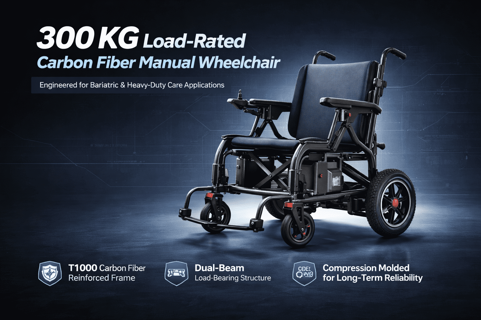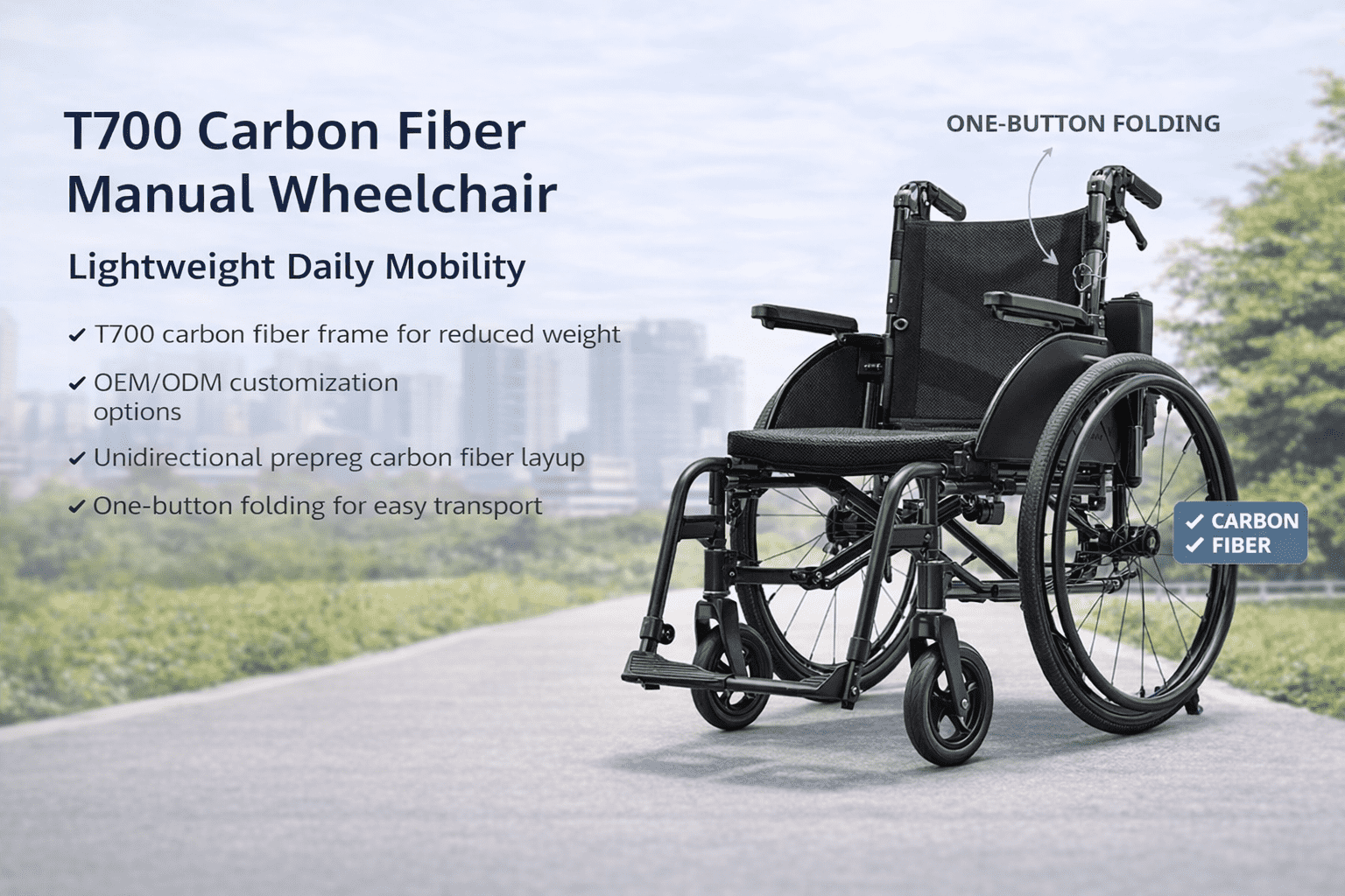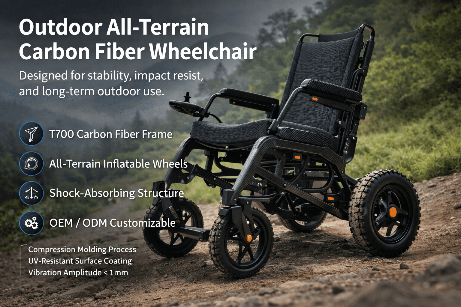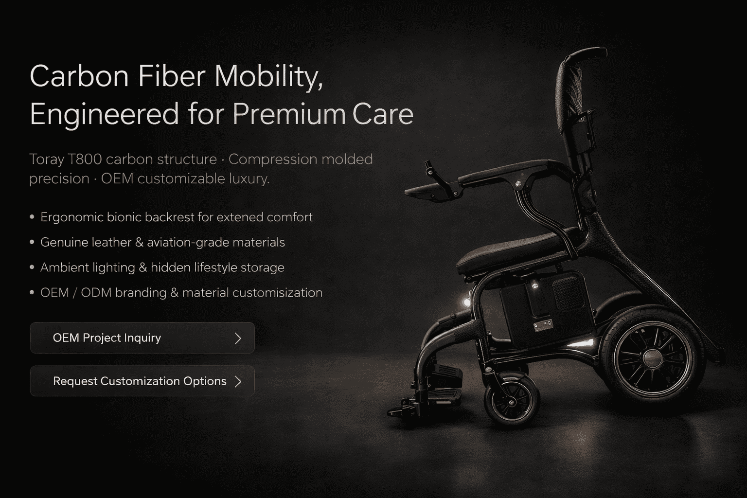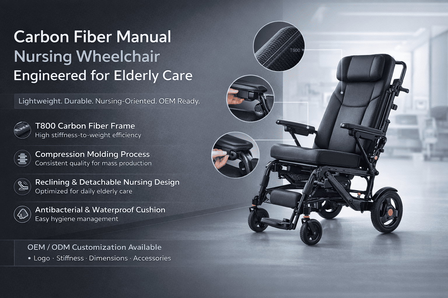 Carbon fiber medical mobility and rehabilitation devices engineered for lightweight strength, ergonomics, and OEM/ODM customization across wheelchair frames, seating modules, and mobility components.