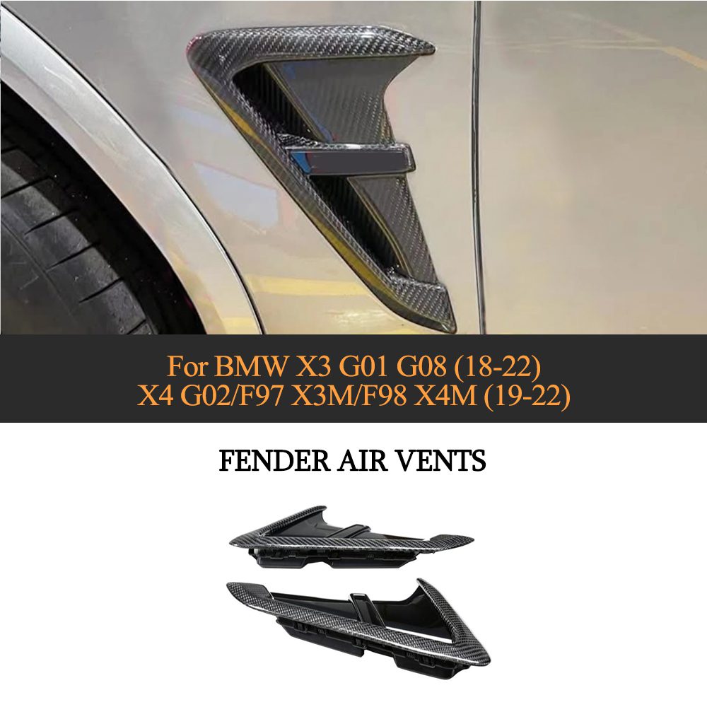 Give your 2018–2022 BMW X3 (G01/G08), 2019–2022 X4 (G02), and 2019–2022 X3M (F97) / X4M (F98) a clean, OEM+ exterior upgrade with these Carbon Fiber + ABS replacement fender air vent trims. Precision-molded for the factory “Air Breather” openings, they add a sharp motorsport look while retaining OE clip points. A real carbon fiber (CFRP) outer skin bonded to an impact-resistant ABS core with a UV-stable clear coat delivers long-lasting gloss (or matte*) and everyday durability.