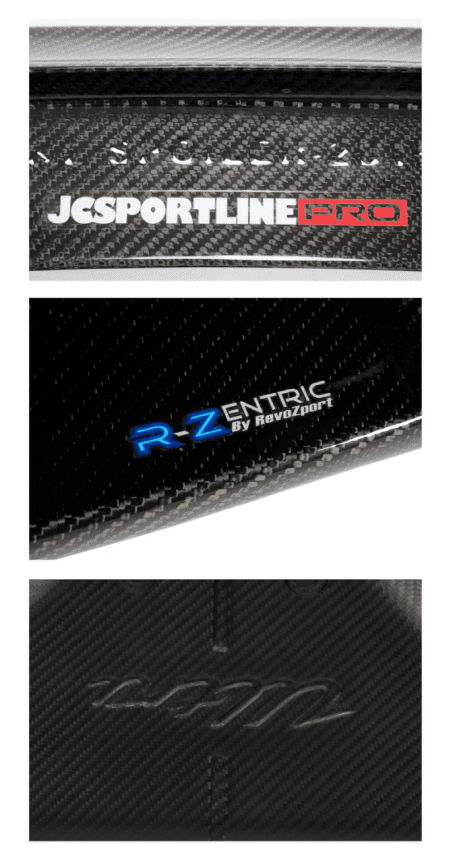 Three logo integration methods are available with distinct application logic. Under-clearcoat logo embeds the brand mark below the protective gloss layer—the logo is visually present and fully protected from UV degradation and physical contact. Surface clearcoat logo maximizes visual impact for retail-facing products where brand visibility is prioritized. Mold-engraved logo is the permanent solution for high-volume OEM carbon fiber supplier production: the brand mark is part of the mold geometry, appearing on every part as a structural feature with no print degradation risk across the production lifetime of the mold.