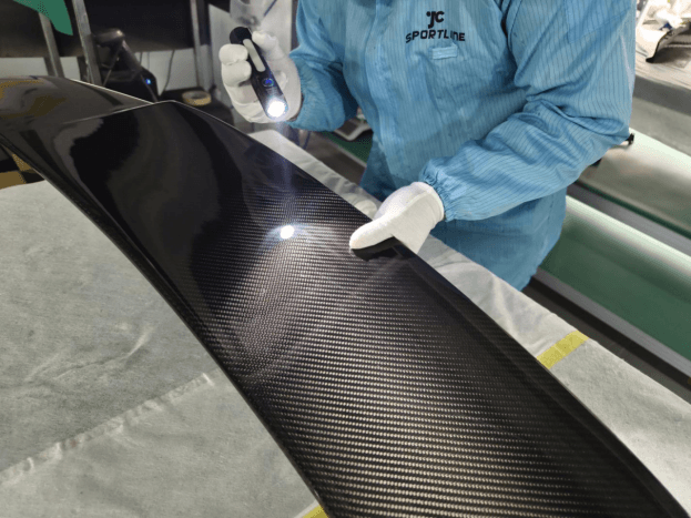 This matters because variance is the most common and most damaging quality failure mode in carbon fiber. A German brand buyer came to us after a series of consistency failures: part weights varying between 10kg and 15kg on the same model, weave orientation misaligned left-to-right on split-panel products, and pattern asymmetry on three-section pieces—all failing against their near-OE tolerance requirement. Every one of those failures traced back to the absence of standardized layup documentation and in-process dimensional control. Standardizing the BOM, fixing the layup sequence per part, and implementing inter-stage scan comparison resolved all of them.