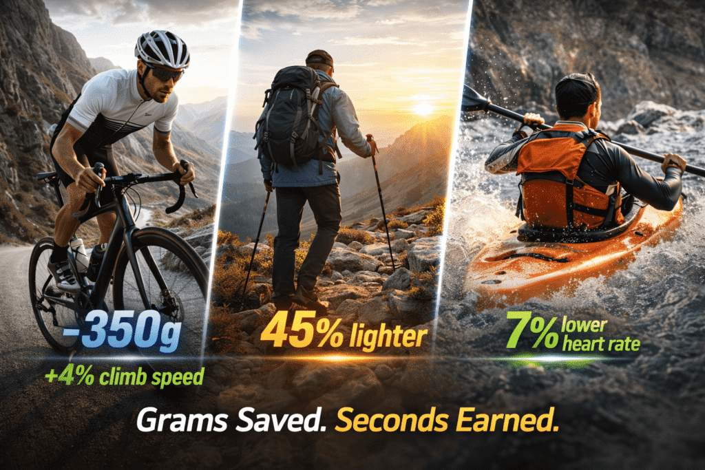 - Performance Correlation: In cycling, hiking, paddling, and skiing, reduced mass directly translates to lower energy expenditure, higher speed, and extended endurance. A 2023 study found that saving 350 g on a road bike frame yields a 4% reduction in climb time—a meaningful advantage even for amateurs.