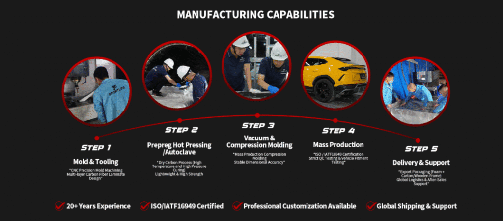 - Compression Molding: For larger parts, such as bumpers and side skirts, we use compression molding. This method involves applying high pressure to mold the parts, ensuring that they maintain their strength and shape under stress, making them ideal for performance applications.