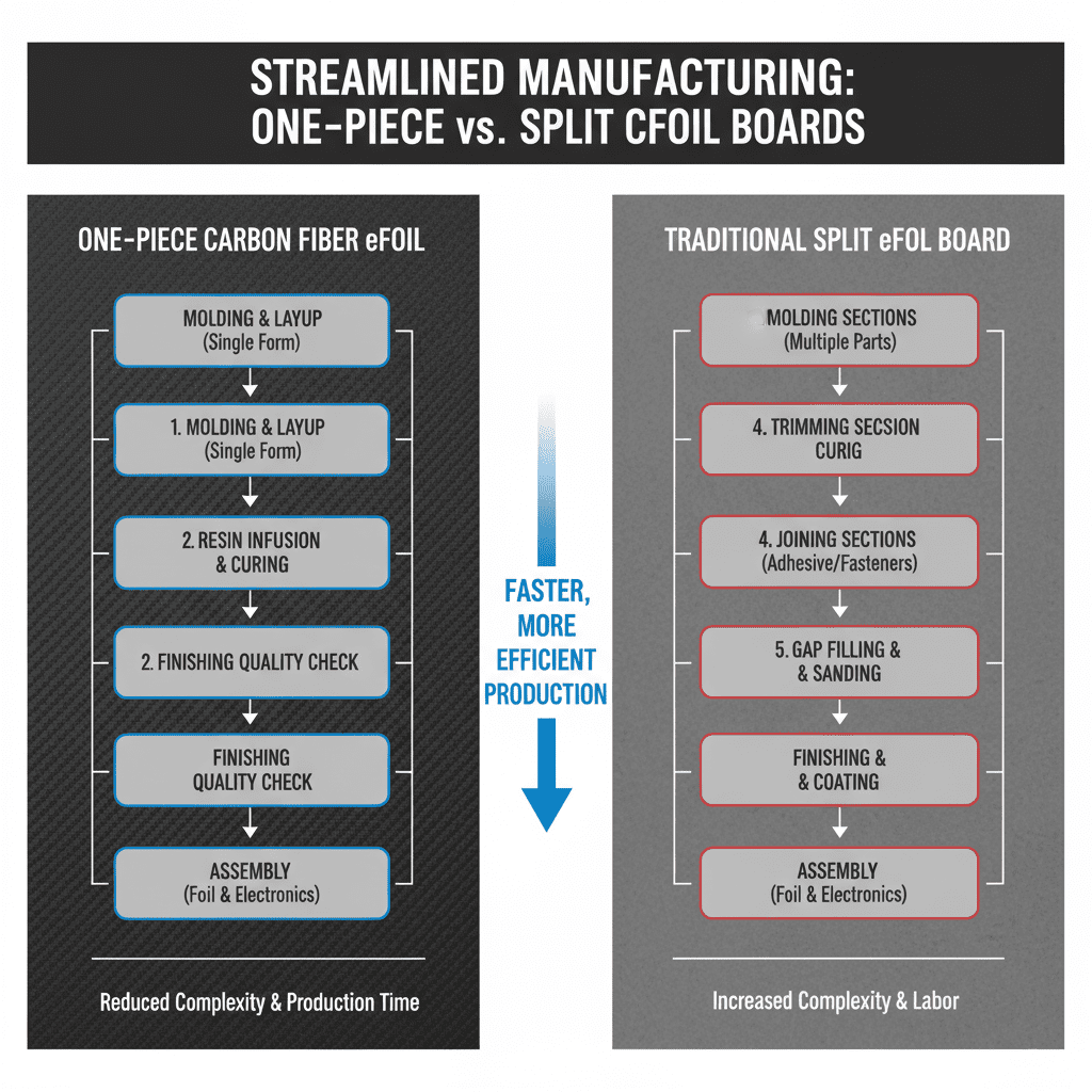 By using fewer parts and streamlined manufacturing techniques, one-piece eFoils can be produced more efficiently, resulting in lower costs. The simplified design reduces the need for specialized assembly, cutting down on labor time and minimizing the chances of defects during production. This, in turn, benefits customers by offering a high-performance, cost-effective product without compromising quality.