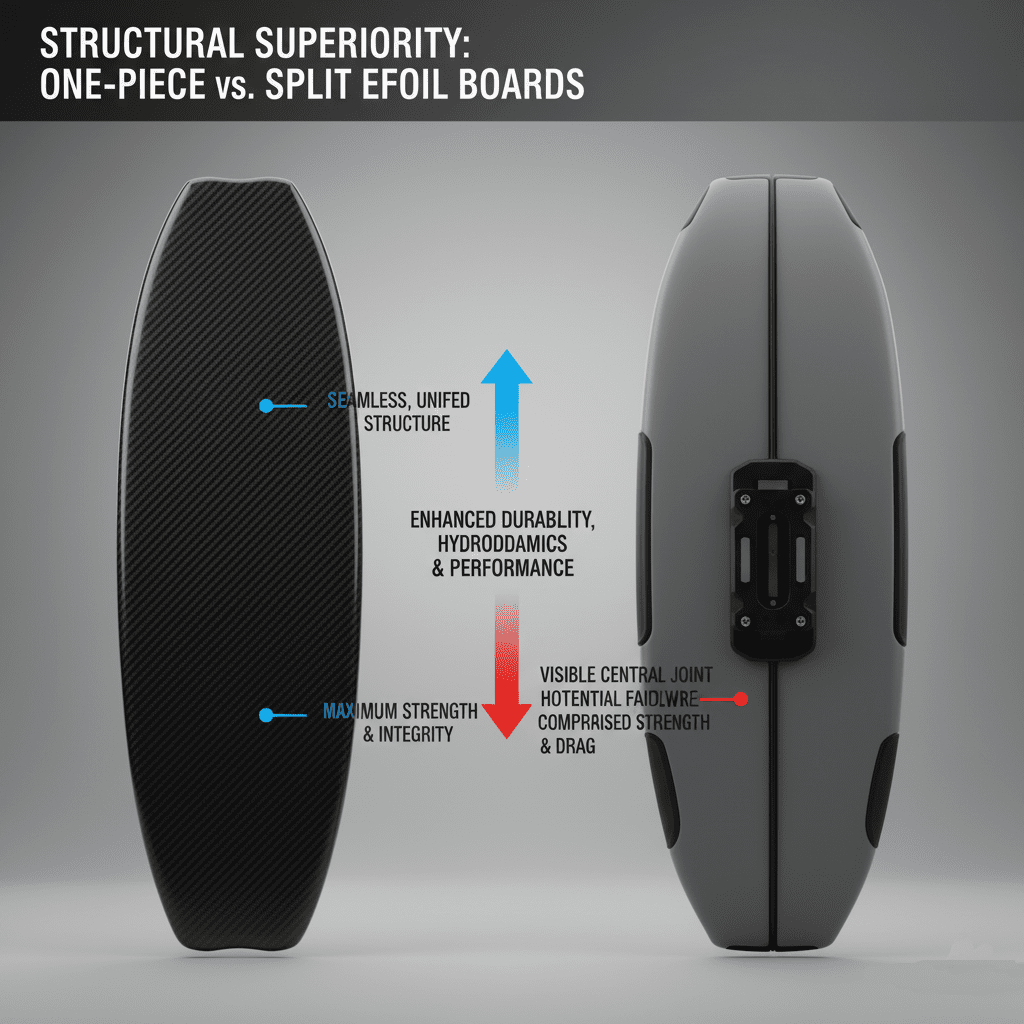- One-piece eFoils offer significant advantages over traditional split boards, including superior strength and durability. Their seamless design reduces weak points, making them more resistant to wear and tear. Additionally, one-piece eFoils have better hydrodynamics, which improves speed, stability, and overall performance on the water. Fewer components also mean fewer points of failure, enhancing their reliability in challenging conditions.