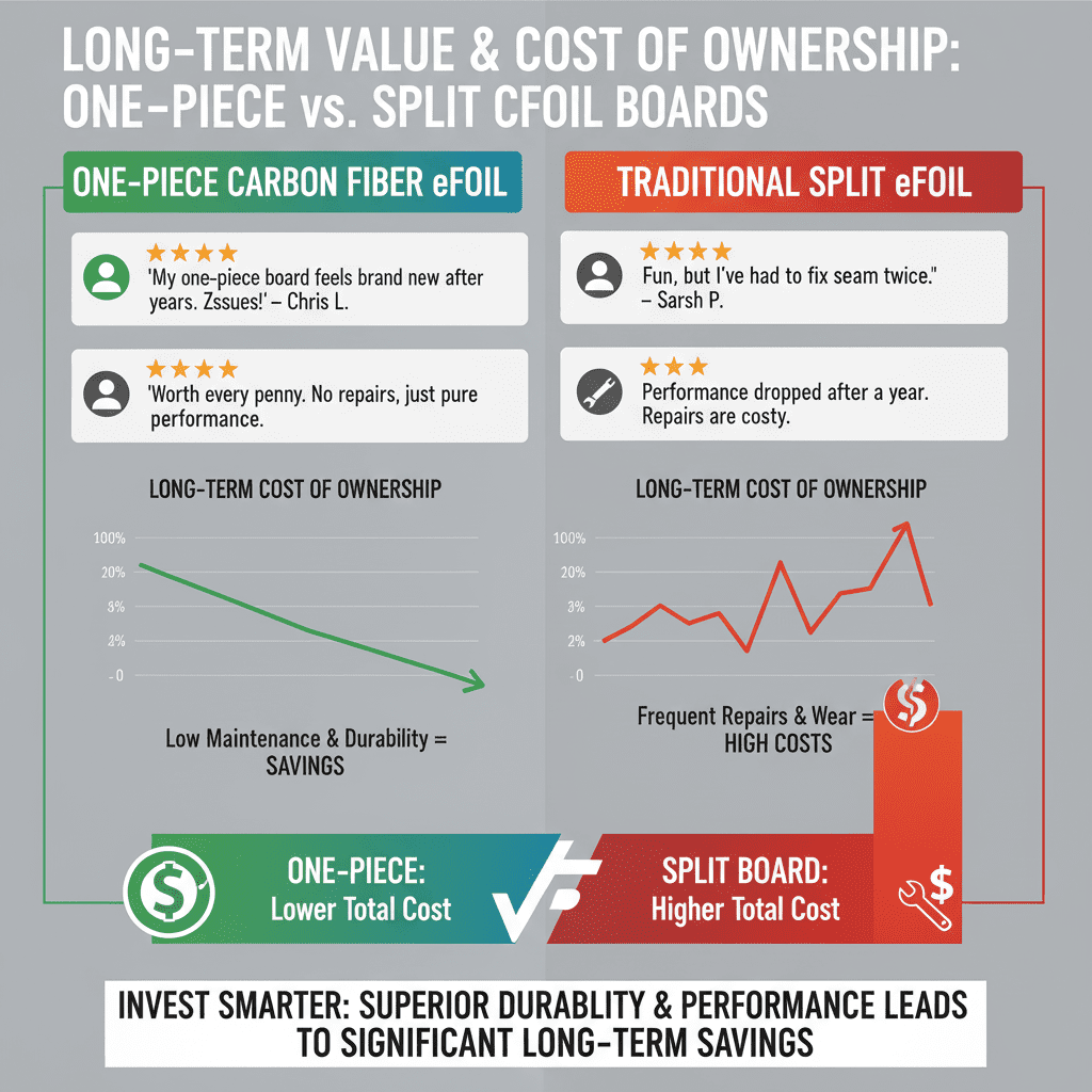- Although the initial cost of one-piece eFoils may be higher due to the advanced carbon fiber materials and manufacturing processes, they offer a better return on investment over time. The enhanced durability, longer lifespan, and better performance of one-piece eFoils reduce the need for repairs and replacements, making them a more cost-effective choice in the long run.