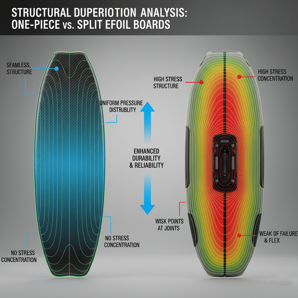 One-piece eFoils are crafted using a seamless construction process, eliminating the need for multiple parts and assembly. This leads to a cleaner, more robust structure that is less prone to failure. Traditional split boards, on the other hand, often have several parts that can weaken over time, especially at the joints. The one-piece design reduces this complexity and increases the durability of the board, making it more resistant to external forces like water pressure and impacts.